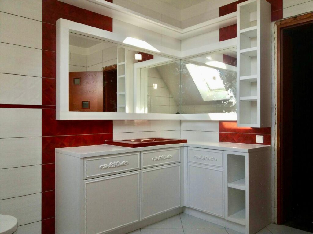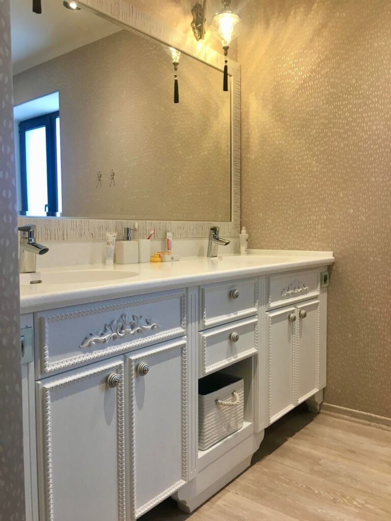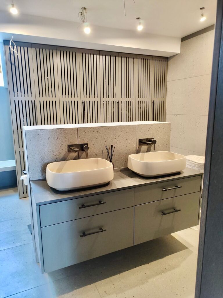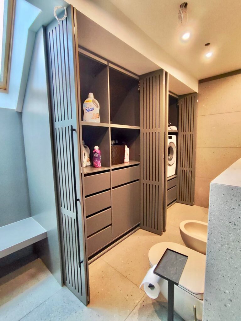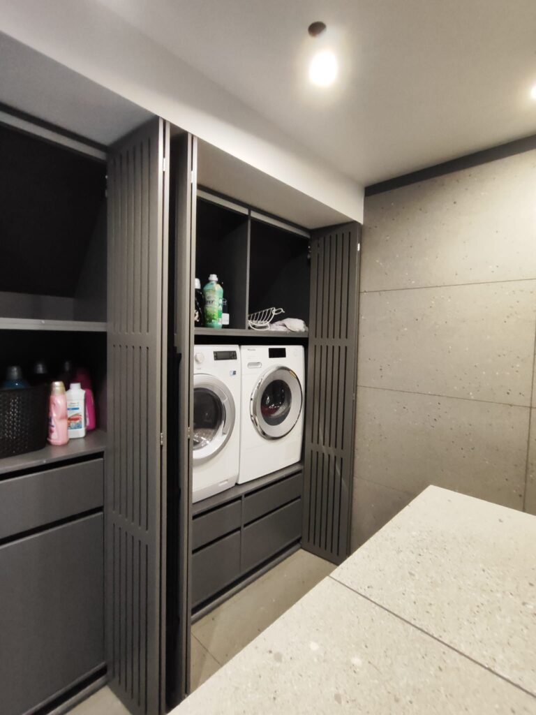 Virtuves iekārta ir izgatavota ar ultramodernām, zīdaini matētām, melnām akrila fasādēm un ozola finierējuma detaļām. Virtuves virsmām ir izmantota Supreme cotton white akmens masa, virsmā ir iestrādāta tās pašas akmens masas izlietne. Stiklotajiem skapīšiem ir integrēta siltā gaisma, kā arī siltā led gaisma ir arī integrēta virtuves salā. Visai virtuvei izmantota blum furnitūra.