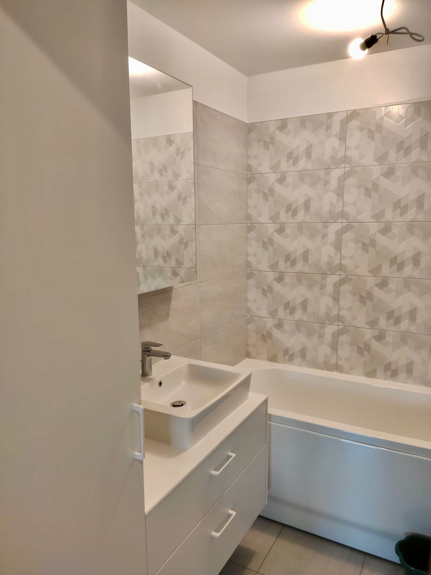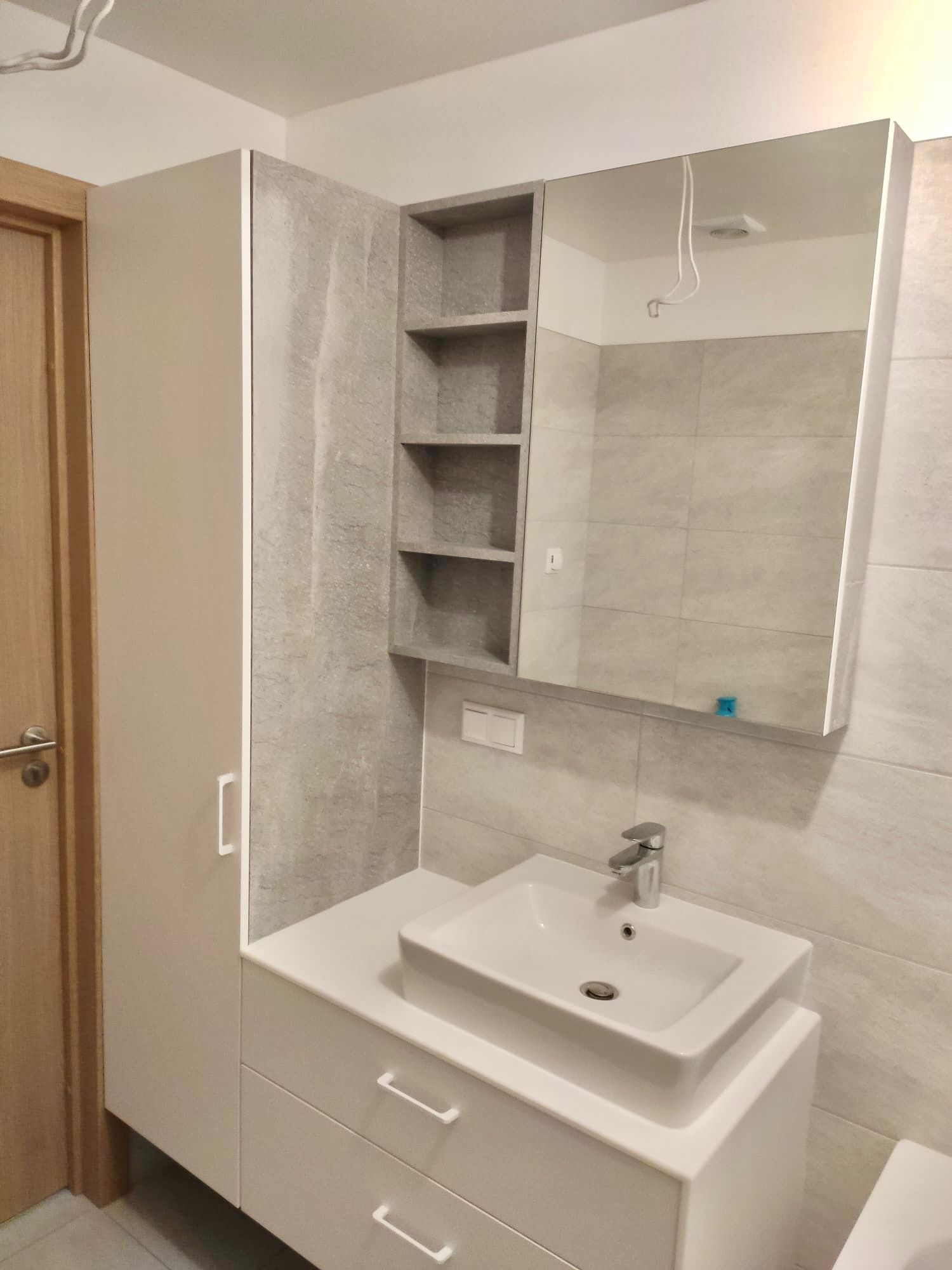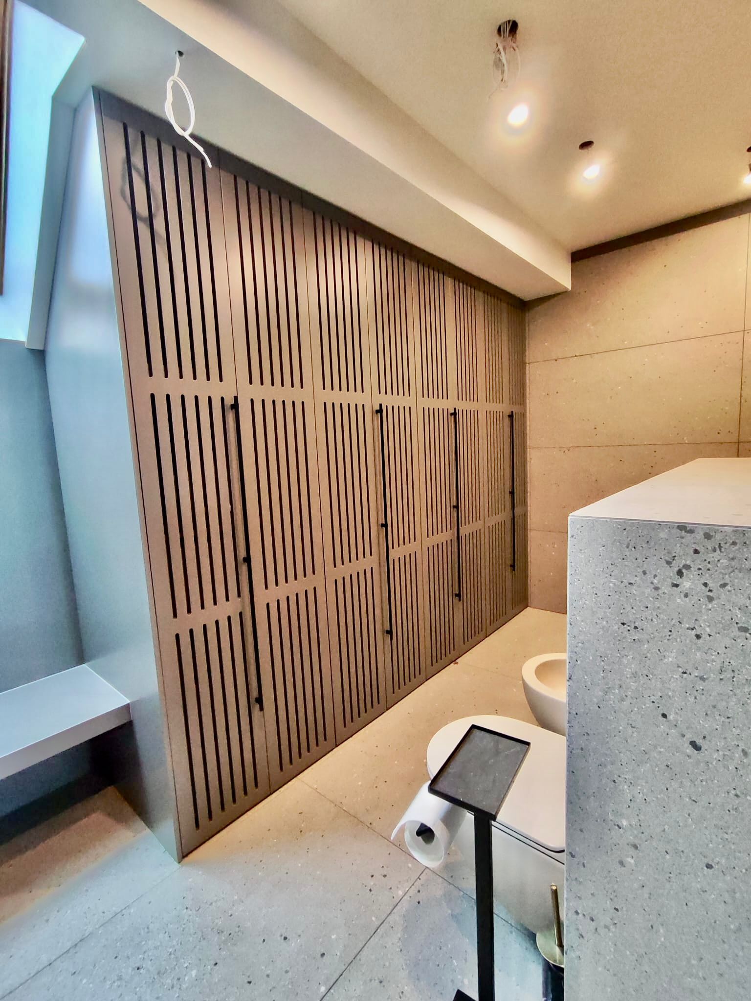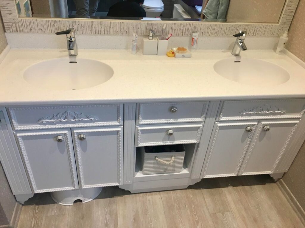 Virtuves iekārta ir izgatavota ar ultramodernām, zīdaini matētām, melnām akrila fasādēm un ozola finierējuma detaļām. Virtuves virsmām ir izmantota Supreme cotton white akmens masa, virsmā ir iestrādāta tās pašas akmens masas izlietne. Stiklotajiem skapīšiem ir integrēta siltā gaisma, kā arī siltā led gaisma ir arī integrēta virtuves salā. Visai virtuvei izmantota blum furnitūra.