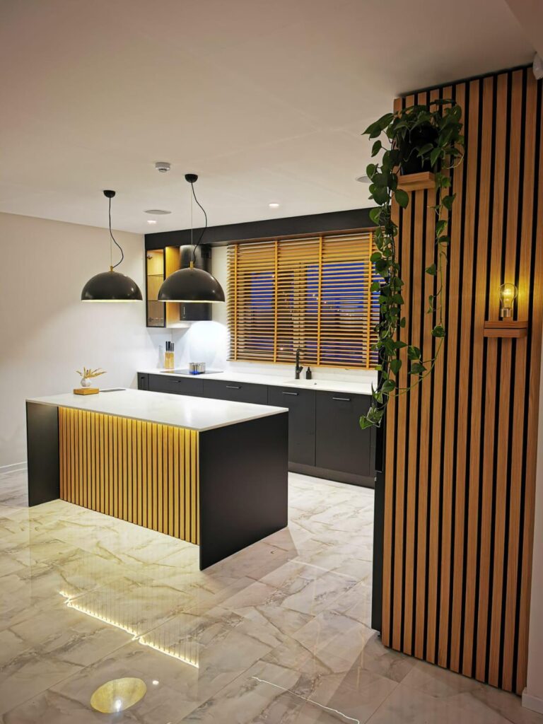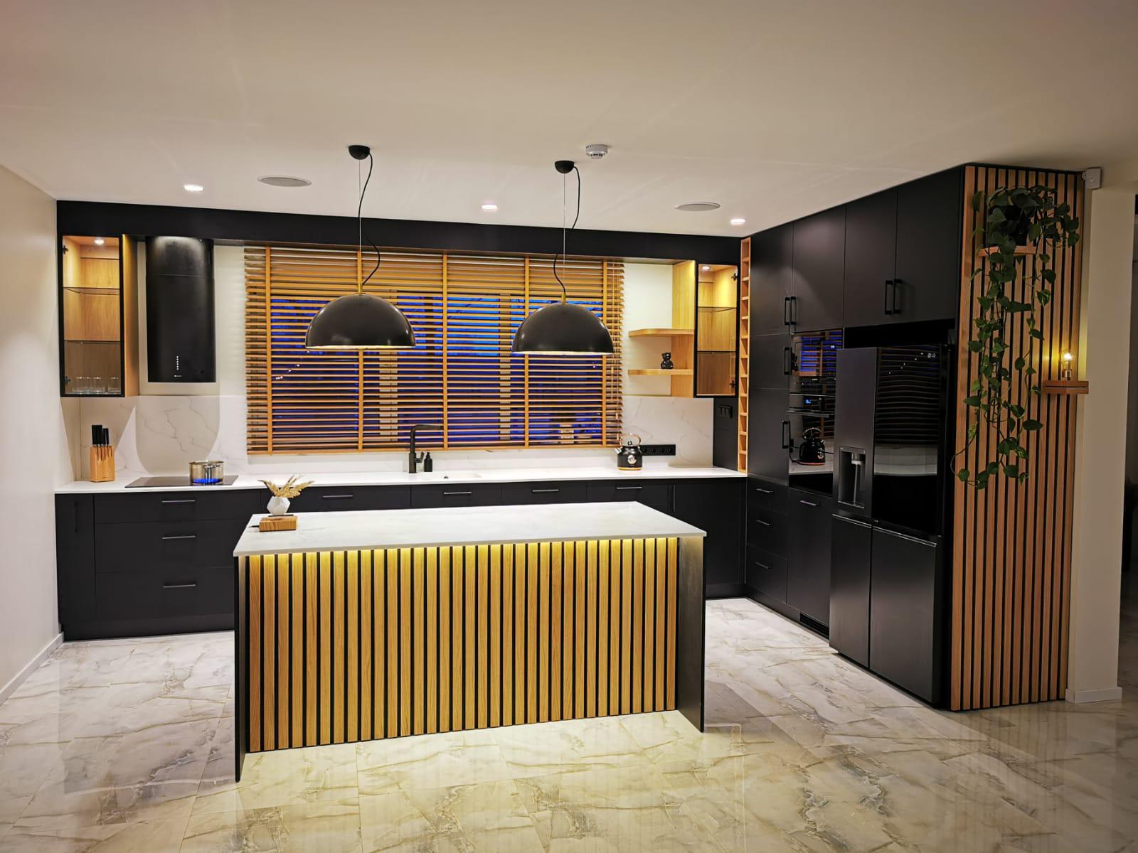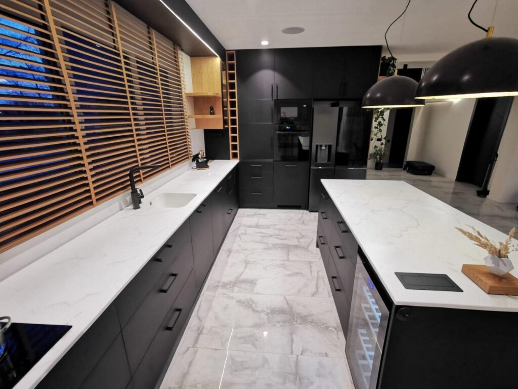 Virtuves iekārta ir izgatavota ar ultramodernām, zīdaini matētām, melnām akrila fasādēm un ozola finierējuma detaļām. Virtuves virsmām ir izmantota Supreme cotton white akmens masa, virsmā ir iestrādāta tās pašas akmens masas izlietne. Stiklotajiem skapīšiem ir integrēta siltā gaisma, kā arī siltā led gaisma ir arī integrēta virtuves salā. Visai virtuvei izmantota blum furnitūra.
