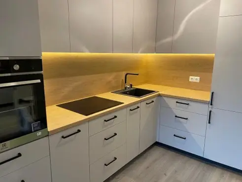 Virtuves fasādēm izmantots matēts balts akrils ar melniem alumīnija rāmjiem, kā arī finierētās ozola dekoratīvās līstes. Virtuves virsma un sienas panelis izgatavots no Eger plastikāta. Skapīšos un virtuves panelī iestrādāts LED apgaismojums. Rokturi slēptie. Visai virtuvei izmantota blom furnitūra.