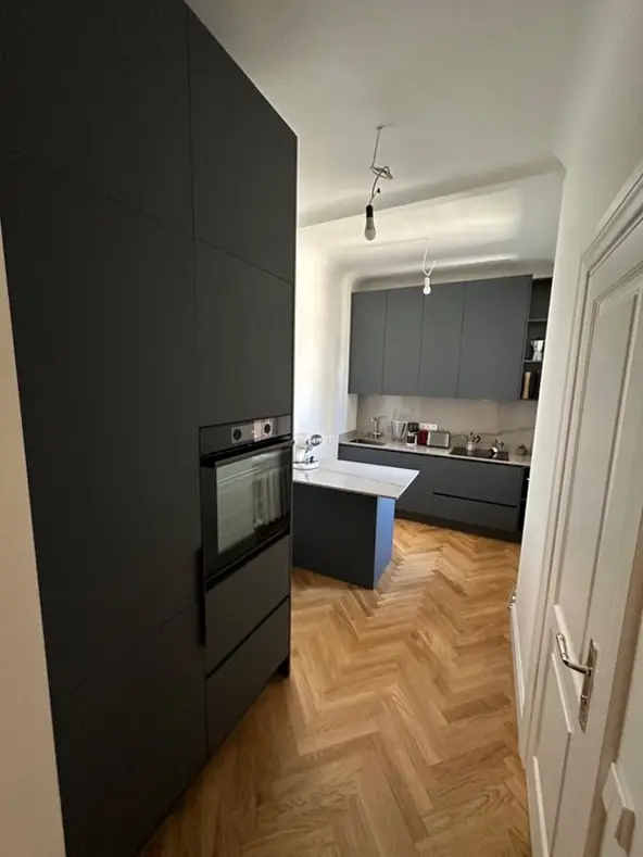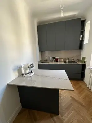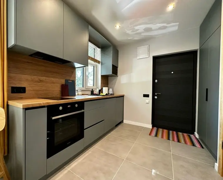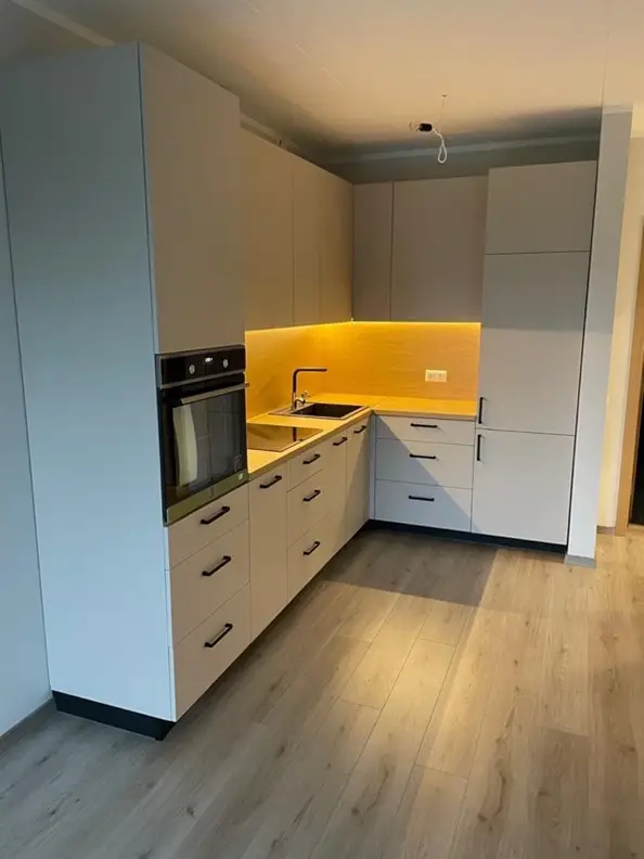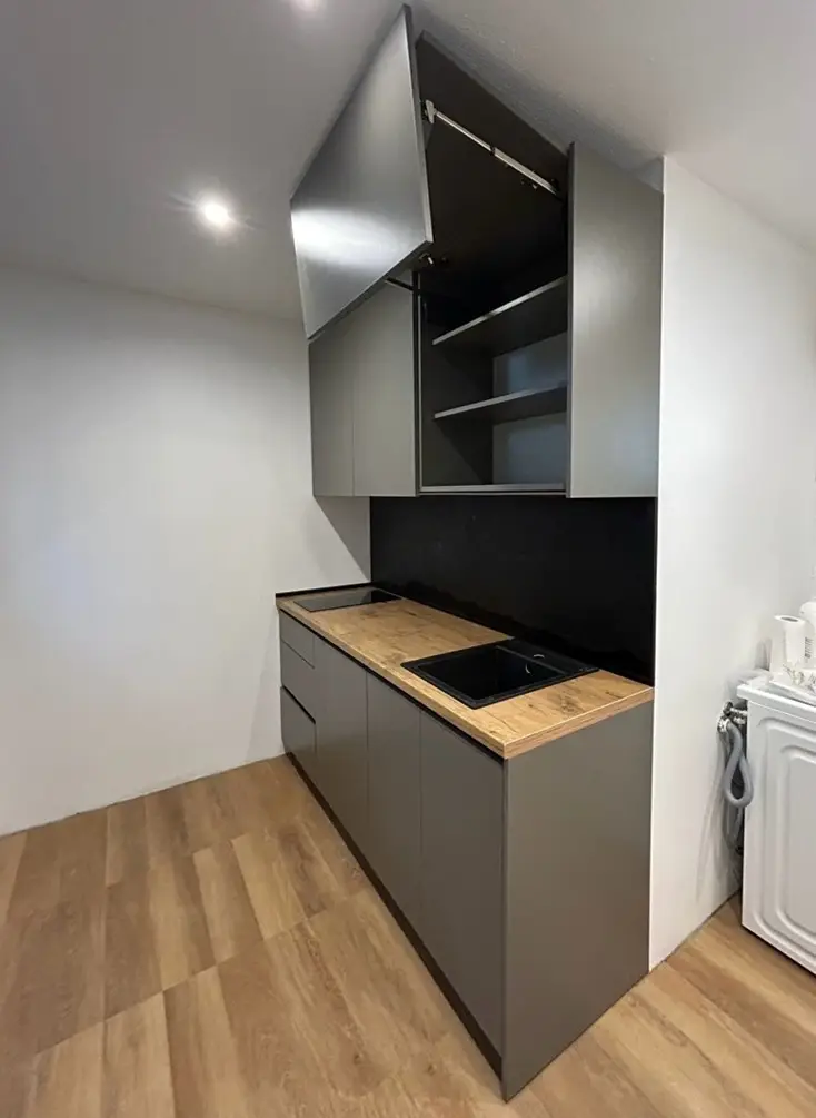 Virtuves fasādēm izmantots pelēks Eger LKSP (laminēta koka skaidu plātne). Virtuves virsmai un panelim izmantota Kronospan plastikāts, kas eleganti izskatās un ir izturīgs pret nodilumu un mitrumu. Virtuvei izmantoti slēptie rokturi. Virtuves virsmā iestrādāta Franke izlietne un ūdens maisītājs. Virs virtuves sienas paneļa ir integrēts neitrāls LED apgaismojums. Visā virtuvē izmantota blom furnitūra.