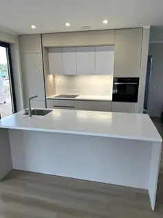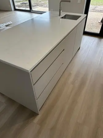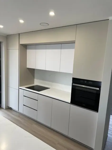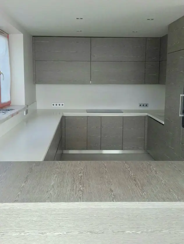 Virtuves fasādēm izmantots gaišs matēts akrils. Atvilktnēm un skapīšiem ir slēptie rokturi. Virtuves fasāde un virsmas ir izgatavotas no baltas akmens masa ar neuzkrītošu rakstu. Salas virsmā ir iestrādāta metāla izlietne. Virs virtuves fasādes ir integrēts neitrāls LED apgaismojums. Visai virtuvei izmantota blom furnitūra.