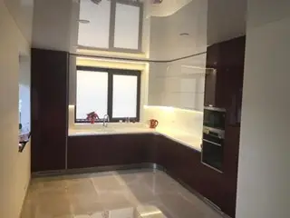 Virtuves fasādei izmantots balts un bordo krāsas glancēts Rehau akrils. Virtuves virsma un sienas panelis ir izgatavots no baltas akmens masas. Šim objektam tika veidots liekts stūris no akmens masas, kā arī no šī paša materiāla tika virsmā iestrādāta izlietne. Virs sienas paneļa iestrādāts LED apgaismojums. Virtuvei izmantota blom furnitūra.