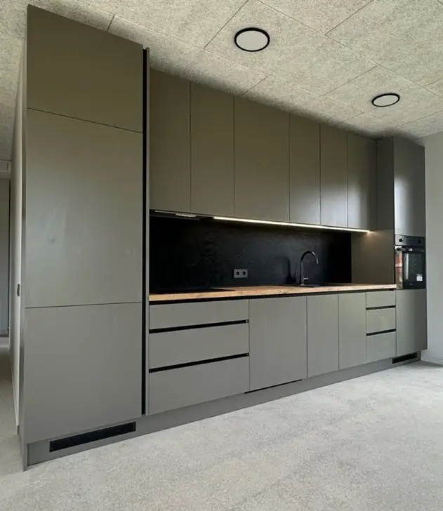 Virtuves fasādēm izmantots Egger Perfect Sense materiāls šim materiālam ir smalks, izsmalcināts, matēts izskats, kas ir izturīgs pret pirkstu nospiedumiem un nodrošina tīru un modernu vizuālo efektu. Virtuves virsma un sienas panelis ir izgatavots no kvarca akmens. Rokturu līstes krāsotas pulvera krāsā, lai maksimāli pieskaņotu elegantajām virtuves fasādēm. Virtuvei izmantota blom furnitūra.